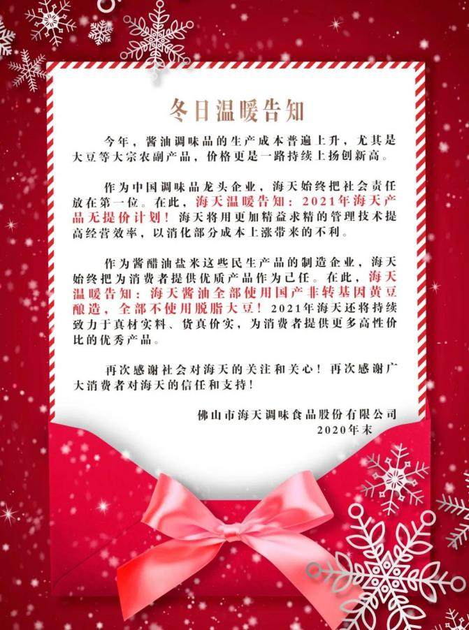记者查询发现,“海天产品2021年无提价计划”一事并未在交易所公告。对此,记者向海天味业发函并致电询问,截至发稿尚无回应。