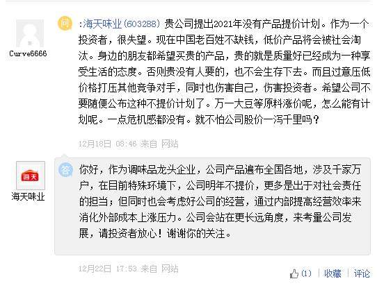 此举引发了投资者质疑。有投资在互动平台提问,“不怕公司股价一泻千里吗?”对此,海天味业回应称,作为调味品龙头企业,公司产品遍布全国各地,涉及千家万户,在目前特殊环境下,公司明年(2021年)不提价,更多是出于对社会责任的担当;但同时也会考虑好公司的经营,通过内部提高经营效率来消化外部成本上涨压力。公司会站在更长远角度,来考量公司发展,请投资者放心。