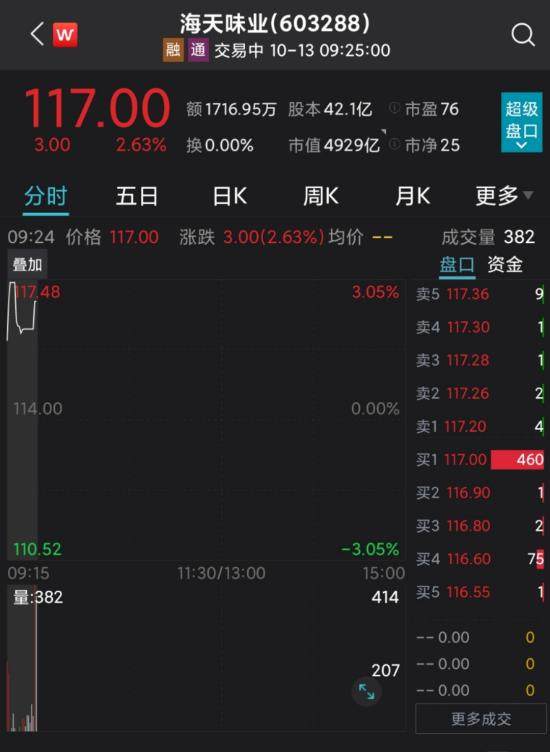 13日早间,海天味业高开2.63%,报价117.00元,总市值4929亿元。