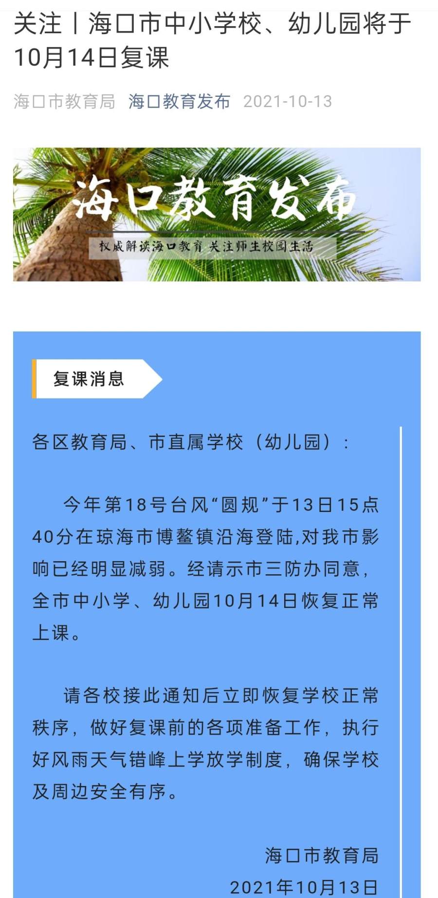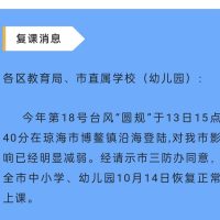 经海口市三防办同意,海口市教育局13日晚发布复课通知,海口全市中小学、幼儿园10月14日恢复正常上课。各校接通知后需立即恢复学校正常秩序,做好复课前的各项准备工作,执行好风雨天气错峰上学放学制度,确保学校及周边安全有序。