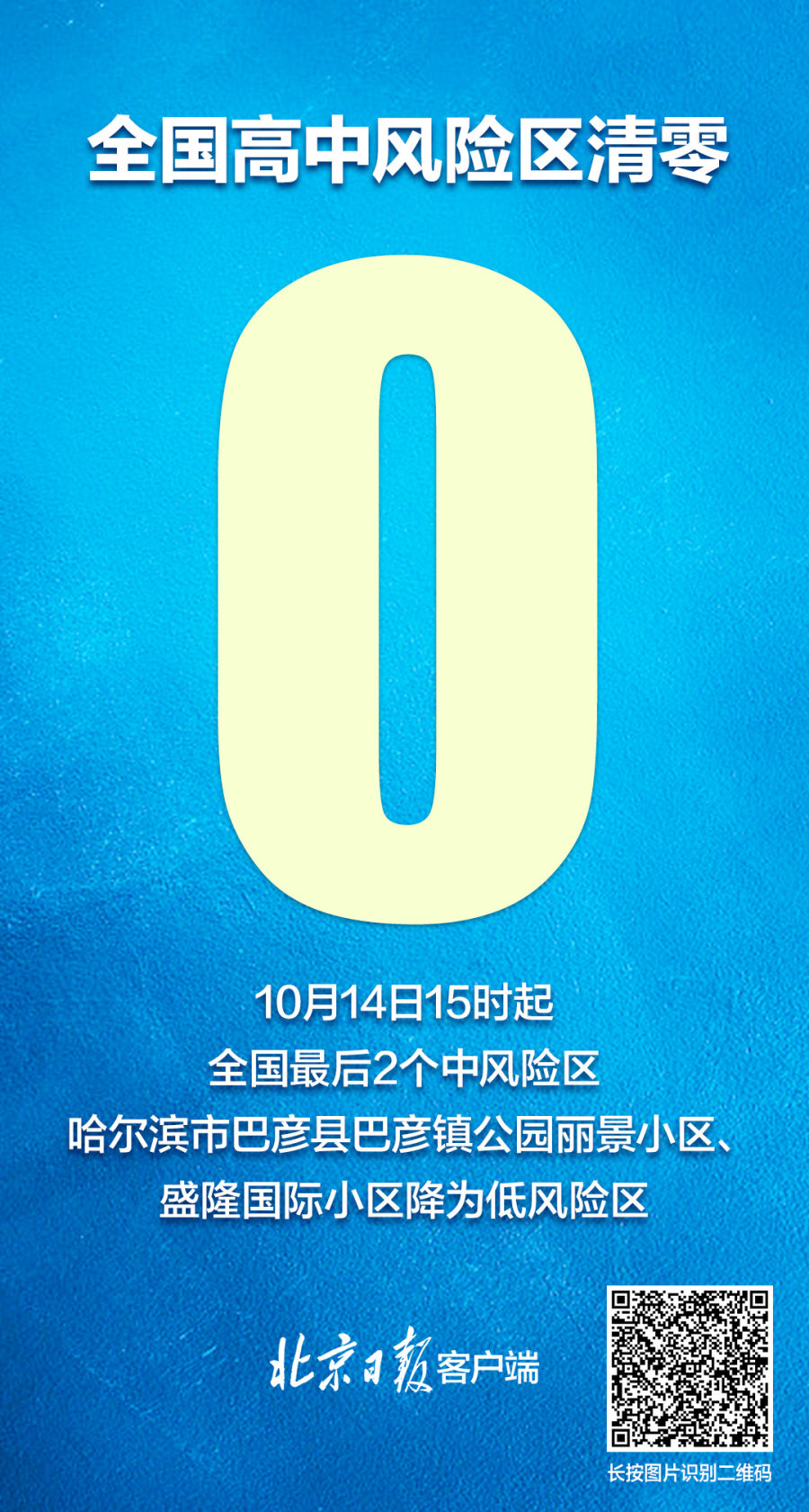 10月14日15时起,全国最后2个中风险区哈尔滨市巴彦县巴彦镇公园丽景小区、盛隆国际小区降为低风险区。