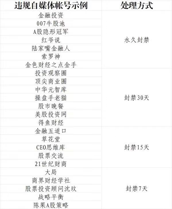 腾讯在此次公告中,重点就24个违规自媒体账号进行公示,其中金融投资、007牛股池、A股隐形冠军等7个账号遭永久封禁;投资观察圈、顶尖商业圈、中华元智库等7个账号遭封禁30天;金融五道口、草花堂、CEO思维库等5个账号遭封禁15天;大局、商界财经学社、股票投资顾问沈玟等5个账号遭封禁7天。