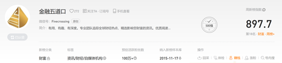 例如以资讯、财经为主要定位的“金融五道口”,该账号于2015年8月24日注册,至今共发布有248篇文章,发布频次也十分活跃,基本保持每日一更。而据新榜统计,其目前预估活跃粉丝数超过100万,本周内在同类公众号中的“新榜指数”可排第18名,更有45次进入中国微信月榜500强,可以说是不折不扣的大V账号。