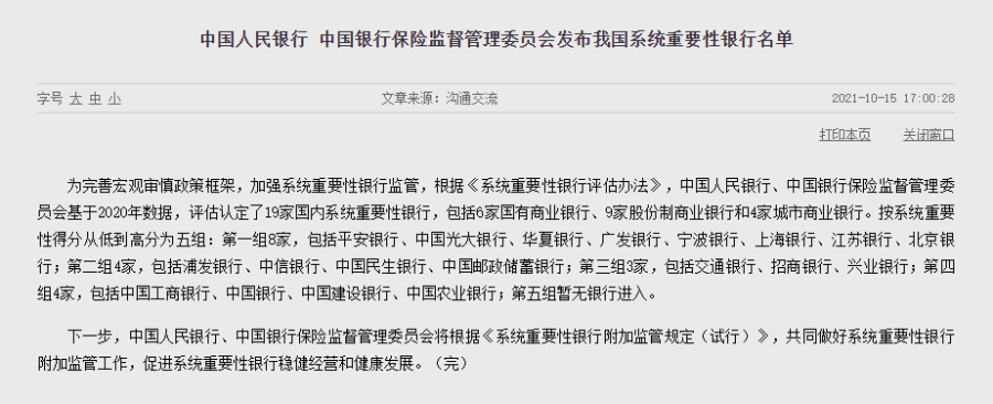 为完善宏观审慎政策框架,加强系统重要性银行监管,根据《系统重要性银行评估办法》,中国人民银行、中国银行保险监督管理委员会基于2020年数据,评估认定了19家国内系统重要性银行,包括6家国有商业银行、9家股份制商业银行和4家城市商业银行。按系统重要性得分从低到高分为五组:第一组8家,包括平安银行、中国光大银行、华夏银行、广发银行、宁波银行、上海银行、江苏银行、北京银行;
