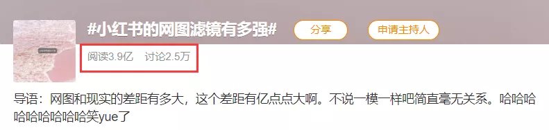 截至目前,“小红书的网图滤镜有多强”的话题的阅读量已经接近4亿次。