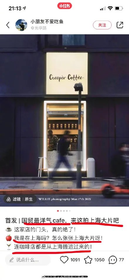 最令记者捧腹大笑的是,小红书上被人吹捧成北京国贸最洋气的咖啡店(见下图),下面的评论“这家店的门头,真的绝了!”,“连咖啡店都是从上海搬运过来”之类的……一度让记者以为在土里土气的北京城里真的有这么一片PK上海十里洋场的宝地。