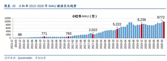 QuestMobile数据显示,截至2017年末,小红书的月活跃用户数量为2022万;而到了2019年末,小红书的月活跃用户数量已经升至8236万。
