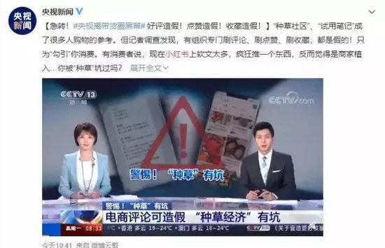 2019年12月,央视揭秘带货圈黑幕,点名小红书存在笔记代写代发、软文过多等问题,种草、试用笔记多为虚假内容,只为吸引消费者购买。