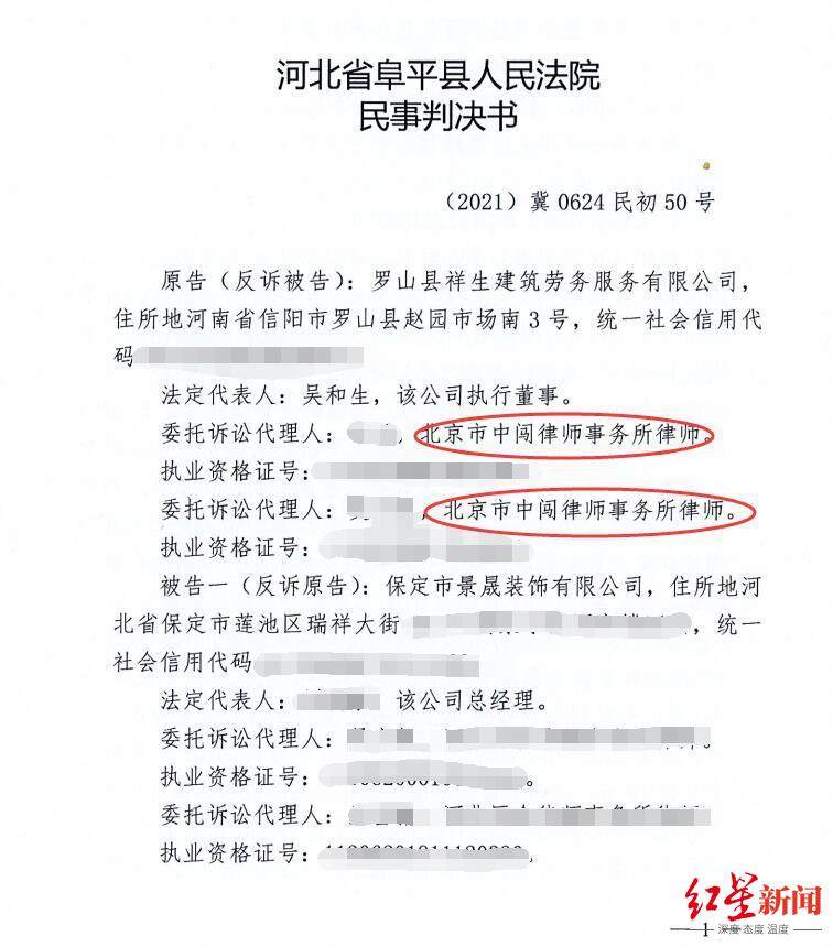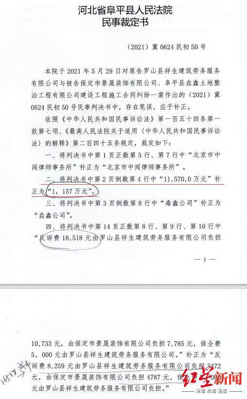 10月15日,记者收到了阜平县人民法院关于此事的回函。法院在回函中表示,在审理罗山县祥生建筑劳动服务有限公司与保定市景晟装饰有限公司、阜平县垚鑫土地整治工程有限公司建设工程施工合同纠纷一案中,由于工作人员责任心不强、审核把关不严,导致案件判决书及补正裁定书中出现多处错误。针对此情况,法院当即启动责任倒查和追责机制,对办案法官、法官助理及主管院领导分别作出停职、提醒谈话、向院党组做出深刻检查、在全院通报批评的处理。