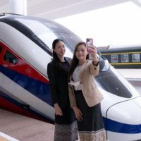 ↑10月16日,两名女子在老挝万象站与“澜沧号”动车组合影。新华社发(凯乔摄)
