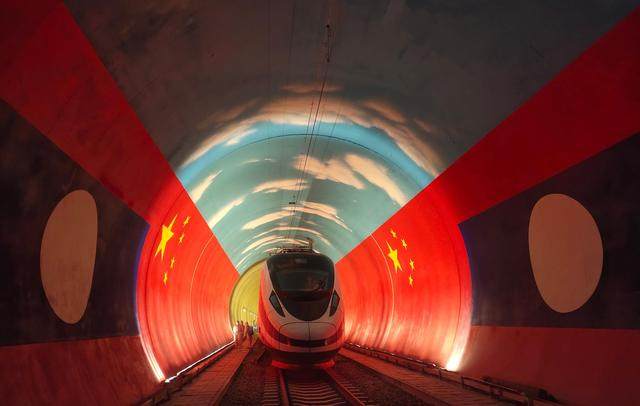 ↑10月15日,“澜沧号”动车组通过中老友谊隧道内的两国边界。新华社发(曹安宁摄)
