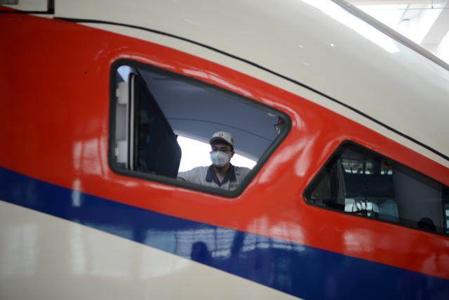 ↑10月16日,中国中车集团员工在老挝万象站检查“澜沧号”动车组。新华社发(苏帕万摄)