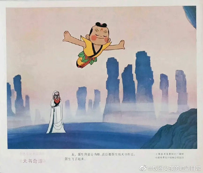 从宣传海报上,我们可以一窥《天书奇谭》的国风之美。国画工笔重彩的群山层峦叠嶂,蛋生张开双臂沿着山中的天梯奔向天际,袁公在下面挥手道别,表达了文化代代相传、永无止境的寓意。海报构图颇为讲究,远山近水的呼应,云蒸霞蔚的氤氲,盘根错节的树木,中国传统文化和思想跃然纸上。