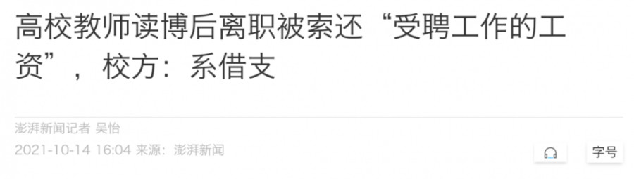 在她攻读完博士要返校任教时,与校方关于家属安置的问题商量未果,便打算离职。校方随后将其告上法庭,要求退还读博期间学校支付的所有费用包括工资、社保、生活补贴等,共计约41.64万元。