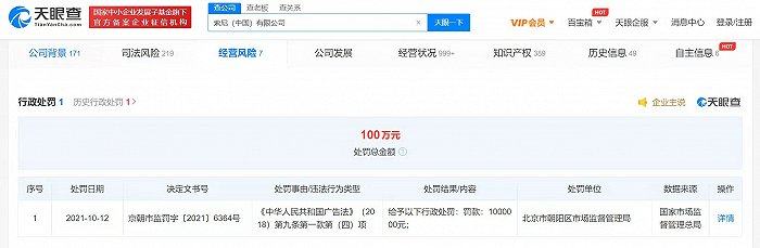 天眼查App显示,近日,索尼(中国)有限公司因违反《中华人民共和国广告法》被北京市朝阳区市场监督管理局罚款100万元。