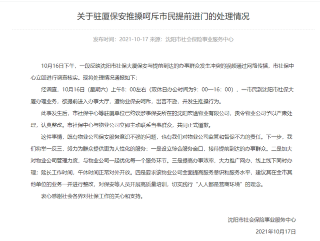 10月17日,沈阳社保中心回应称已责令物业公司予以严肃处理,认真整改,并表示将举一反三,努力为群众提供更为人性化的服务。17日晚,涉事物业公司致歉,称涉事保安孙某已被辞退。