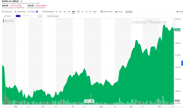 9月推出《鱿鱼游戏》收视火爆,Netflix股价大幅上扬。(来源:雅虎财经)