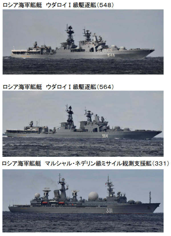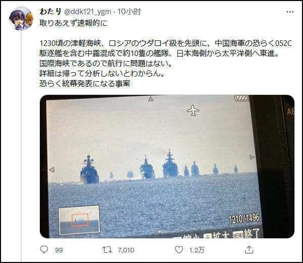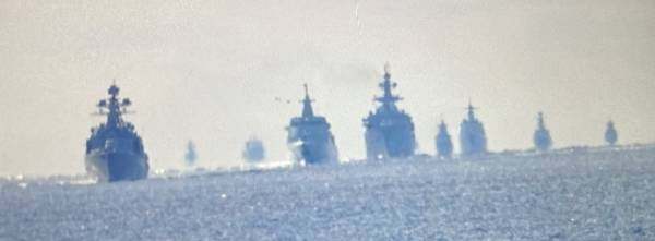 中俄海军编队正在通过津轻海峡公海航道,在并不宽敞的海峡中显得浩浩荡荡(日本网民拍摄)