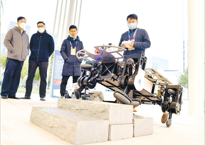 郑州主会场 工作人员在操作轮足机器人翻越障碍