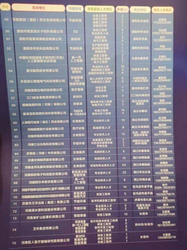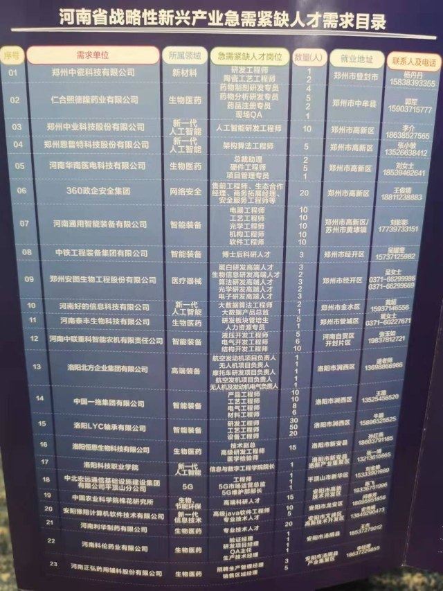 在昨天下午举行的河南省战略性新兴产业急需紧缺人才需求发布暨郑州中原科技城推介会上,河南省战略性新兴产业急需紧缺人才需求目录正式发布,包含全省18个地市的75家企事业单位,共834个岗位需求。