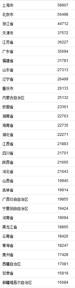 榜单显示,上海前三季度居民人均可支配收入达到了58907元,逼近6万元大关,继续高居第一。