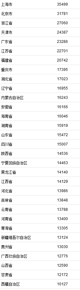 跟全国水平相比,上海、北京、浙江、天津、江苏、广东、福建、山东、辽宁9省份居民人均可支配收入跑赢了全国水平。