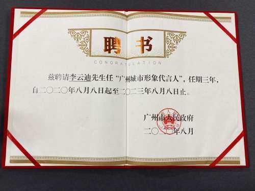 另据公开报道,2020年8月8日晚,在广州塔举办的“岭南之窗”广州文旅融合创新示范区项目开幕仪式上,广州市人民政府邀请国际钢琴大师 李云迪担任广州城市形象代言人,市长温国辉为李云迪颁发了聘书。