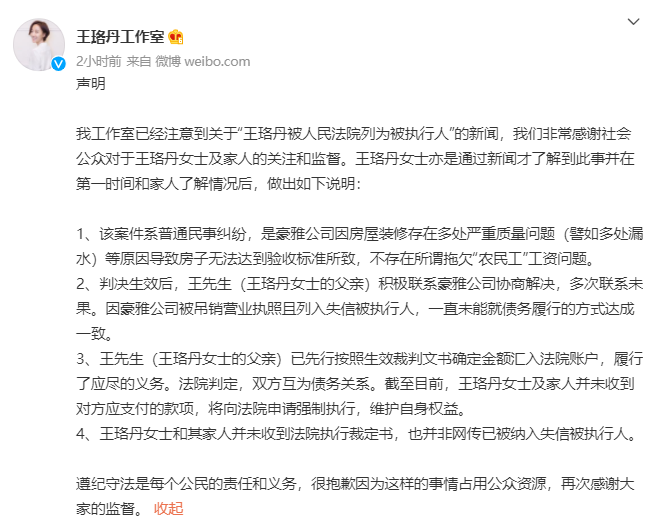 10月22日,针对王珞丹被人民法院列为被执行人一事,其工作室发声明称,该案件系普通民事纠纷,是豪雅公司因房屋装修存在多处严重质量问题(譬如多处漏水)等原因导致房子无法达到验收标准所致,不存在所谓拖欠“农民工”工资问题。