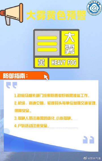 郑州市发布大雾黄色预警,市区将出现能见度小于500米的雾