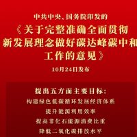 中共中央、国务院印发的《关于完整准确全面贯彻新发展理念做好碳达峰碳中和工作的意见》24日发布。作为碳达峰碳中和“1+N”政策体系中的“1”,意见为碳达峰碳中和这项重大工作进行系统谋划、总体部署。根据意见,到2030年,经济社会发展全面绿色转型取得显著成效,重点耗能行业能源利用效率达到国际先进水平。到2060年,绿色低碳循环发展的经济体系和清洁低碳安全高效的能源体系全面建立,能源利用效率达到国际先进水平,非化石能源消费比重达到80%以上。