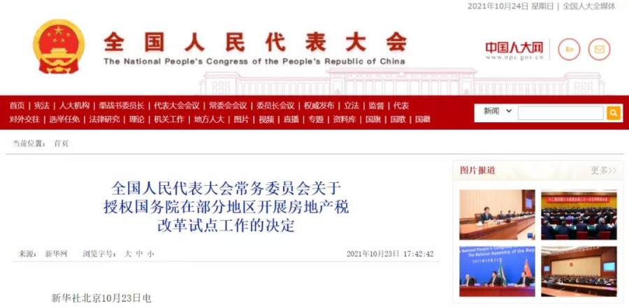 ▲据新华社消息,10月23日,第十三届全国人民代表大会常务委员会第三十一次会议作出决定,授权国务院在部分地区开展房地产税改革试点工作。
