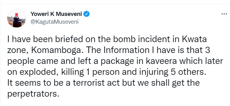 乌干达总统穆塞韦尼当地时间24日在社交媒体上发文对此予以谴责,强调乌方将打击一切犯罪活动,呼吁民众勿因此恐慌。乌警方同日发表声明表示,该爆炸事件是一起“蓄谋已久的国内恐怖主义行为”。事件过程中,3人伪装成食客前往该餐馆点餐并留下装有爆炸装置的包裹,其后离开并引爆爆炸装置。声明说,当前乌警方正在追捕疑犯,要求乌民众高度警惕周边环境和可疑人员。声明还称,英国、法国政府此前确曾发布恐怖警示,但并未提供相关具体信息,有关媒体不应炒作此事,更不应因此指责乌警方。