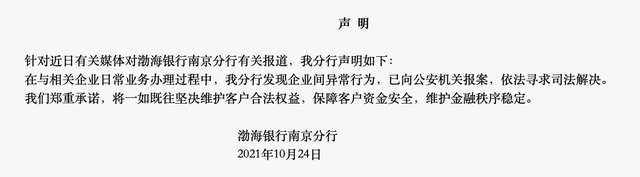此事发酵后,10月24日,渤海银行南京分行发布声明称:“在与相关企业日常业务办理过程中,我分行发现企业间异常行为,已向公安机关报案,依法寻求司法解决。我们郑重承诺,将一如既往坚决维护客户合法权益,保障客户资金安全,维护金融秩序稳定。”