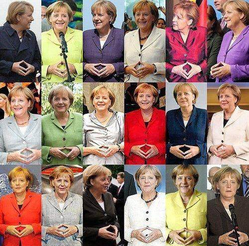 ↑默克尔标志性的西装加标志性的手势。