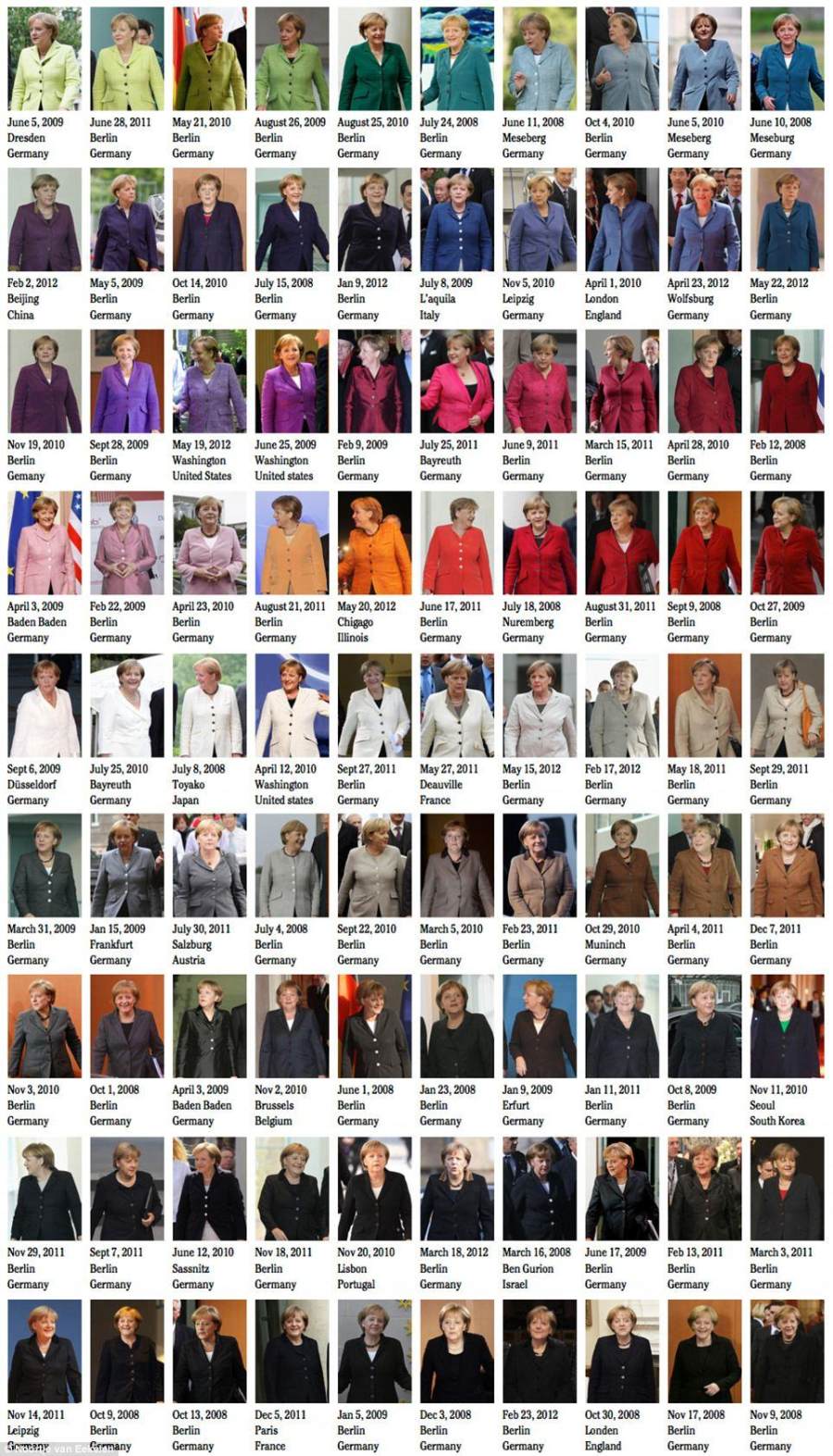 以至于在2012年,一位荷兰平面设计师整理出她过往穿着西装上衣亮相的照片,五彩斑斓跃然纸上,俨然一份色谱大全,而他便给这份拼图作品起名为“国际标准色卡默克尔”。