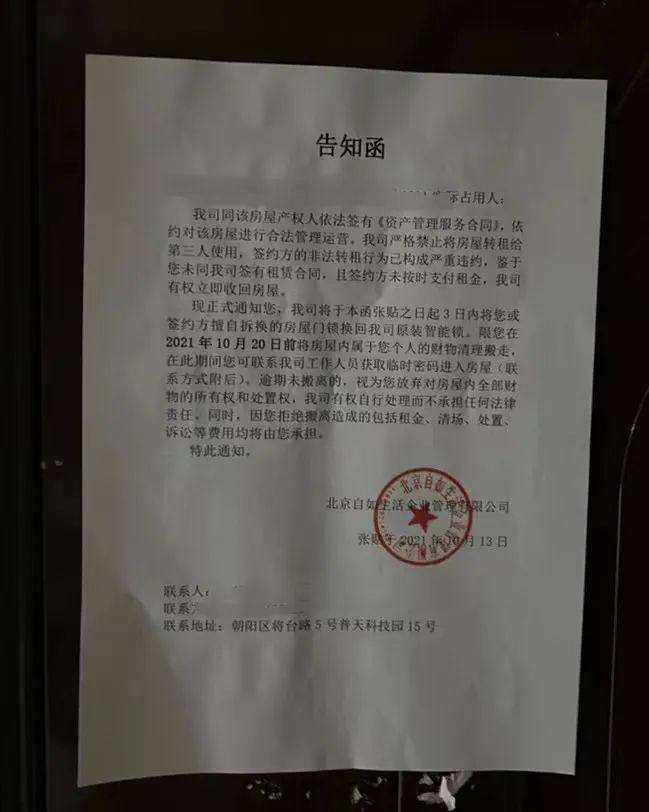 10月12日、10月13日,王涵(化名)连续两天在门口看到自如的告知函,被要求其在10月20日前搬走。察觉不对后,她立刻联系张某要求退房。
