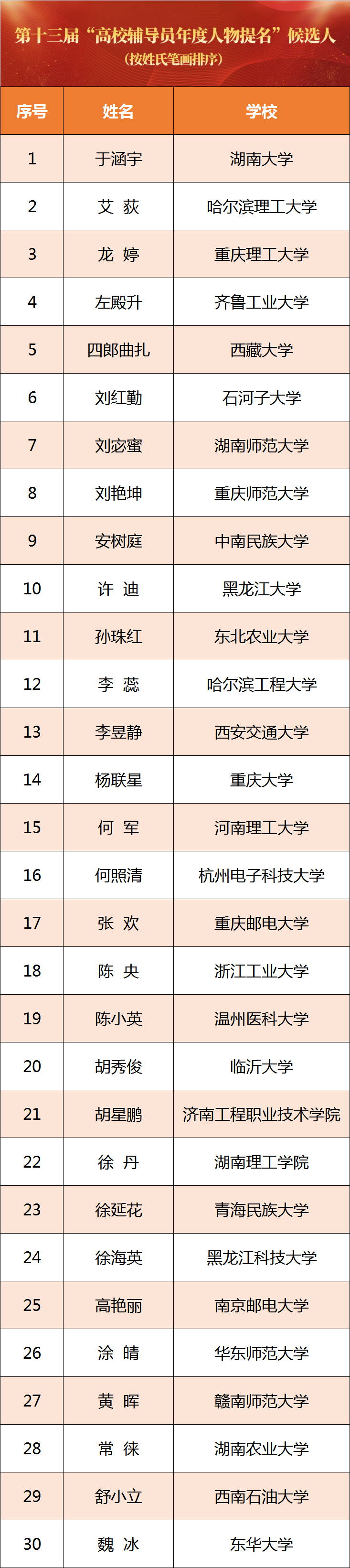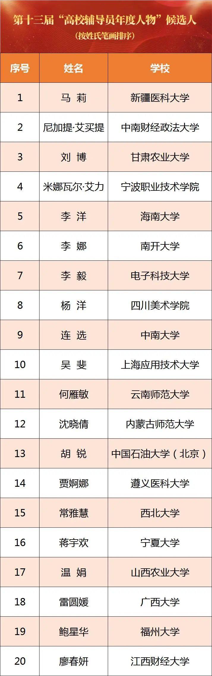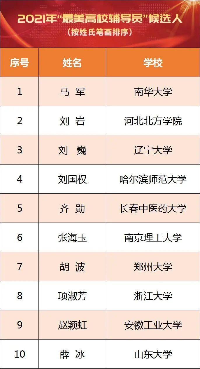 近日,教育部组织开展了第十三届“高校辅导员年度人物”暨2021年“最美高校辅导员”推选展示活动,日前共遴选出“最美高校辅导员”候选人10名,“高校辅导员年度人物”候选人20名、“高校辅导员年度人物提名”候选人30名,并进行公示。公示期为2021年10月27日—11月2日。一起来看名单——