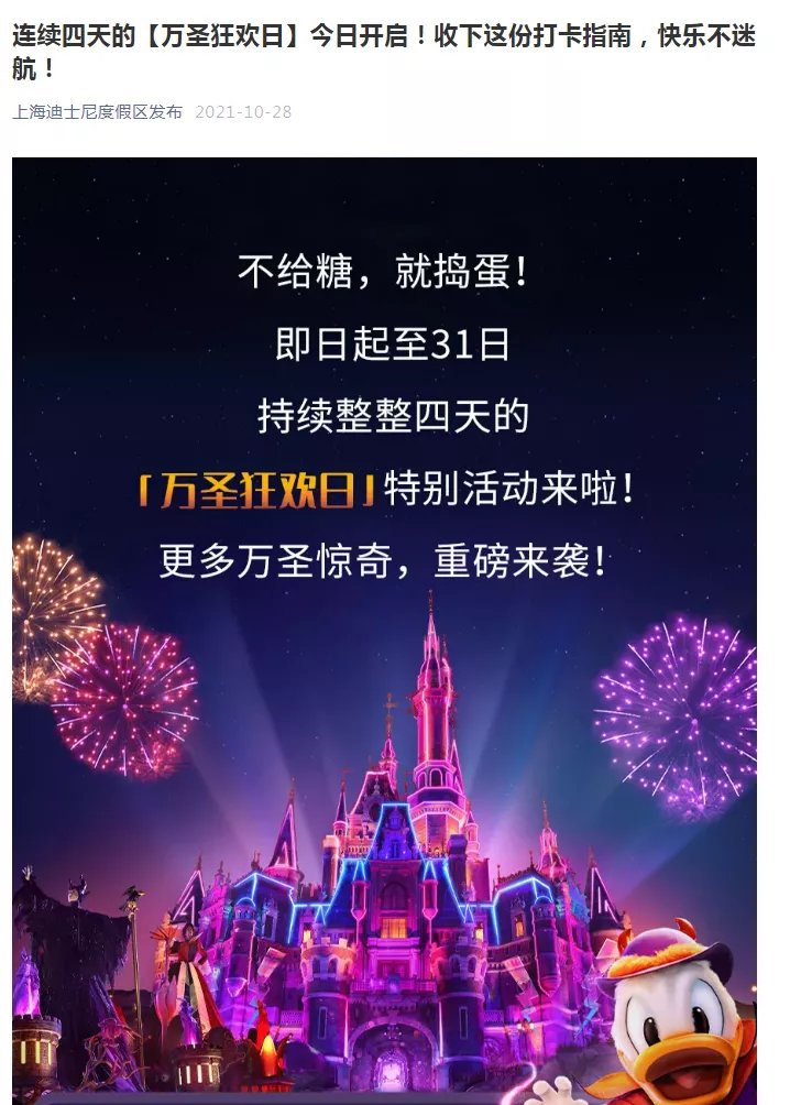 据悉,上海迪士尼度假区官方微信公众号发布的信息显示,28日至31日,度假区举办“万圣狂欢日”活动,包括派对等多项特别活动。 31日上午度假区还发文宣传活动,称“万圣狂欢正在继续”