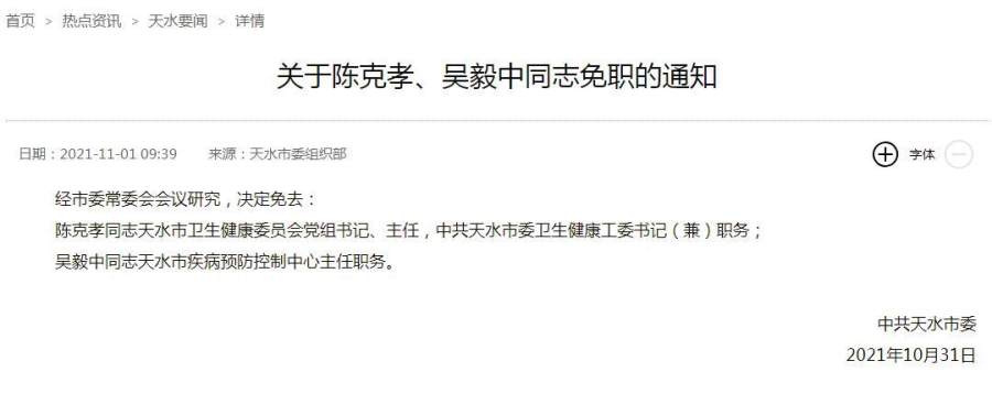 甘肃天水市卫健委主任、疾控中心主任被免职