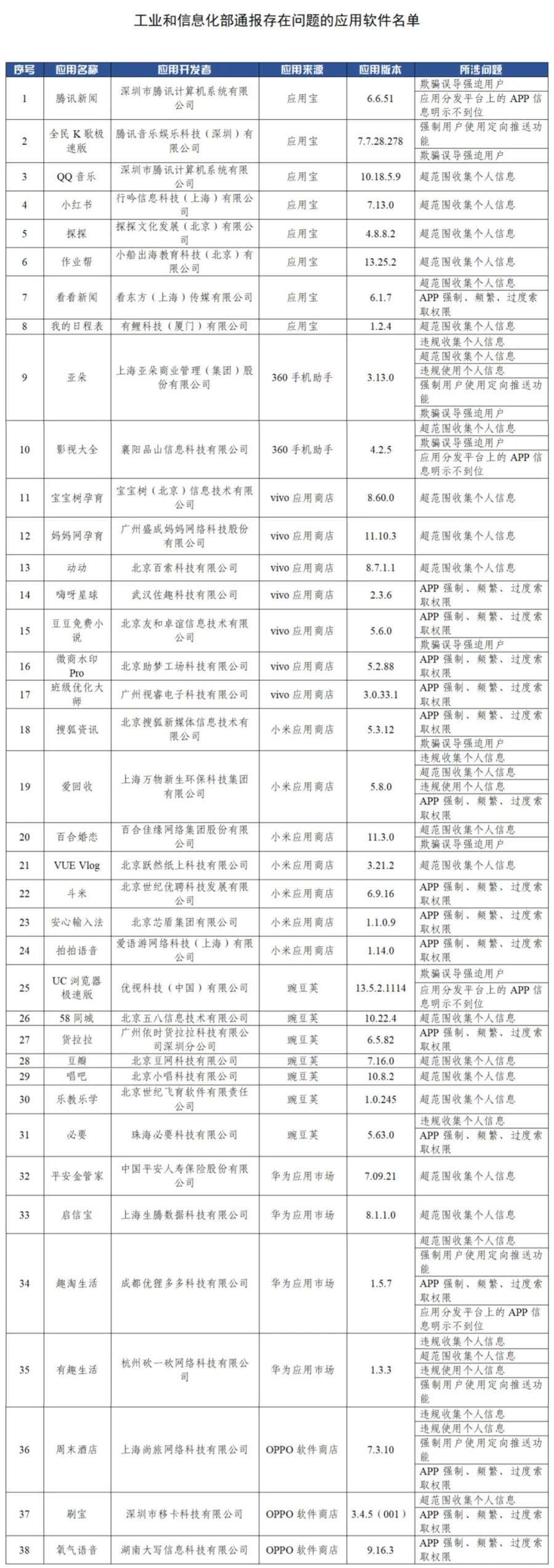 工信部通报38款违规APP,涉及超范围索取权限、过度收集用户个人信息等问题,腾讯新闻、QQ音乐、小红书等APP在列。