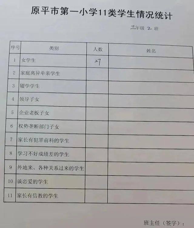 最近,山西省忻州市原平市第一小学的一张学生情况统计表在网上热传。表格中,学校调查学生家庭情况,并据此将学生分为11类,包括“领导子女”“权势垄断部门子女”“家长有犯罪前科的学生”等,甚至还有“谈恋爱的学生”“女学生”这样让人莫名其妙的分类。