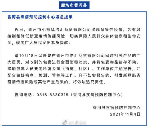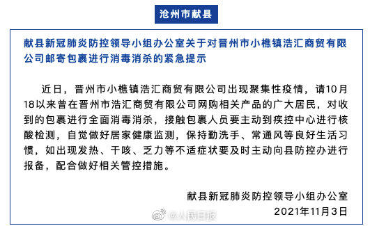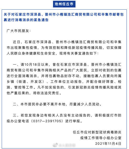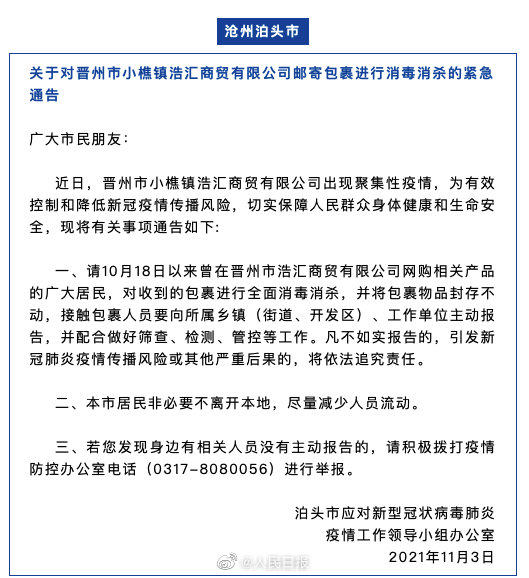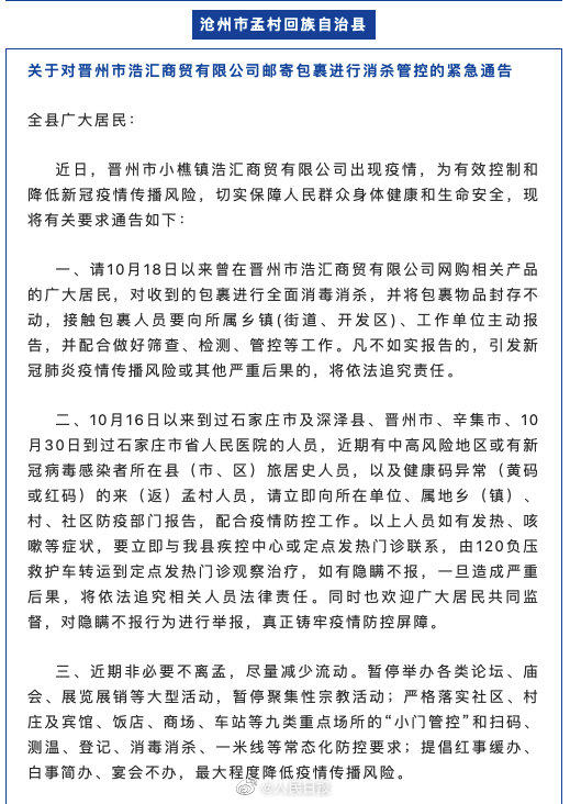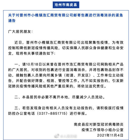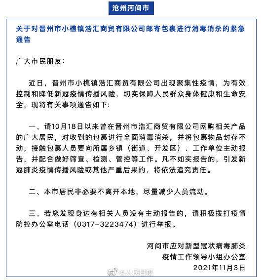 近日,由于河北晋州市小樵镇浩汇商贸有限公司出现聚集性疫情,河北7地发布紧急通告,要求10月18日以来曾在该公司网购相关产品的市民,对收到的包裹进行全面消杀,并将物品封存不动,接触包裹人员要主动报告。扩散,自查!