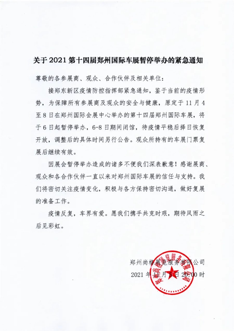 郑州国际车展暂停举办,待疫情平稳后择日恢复开放