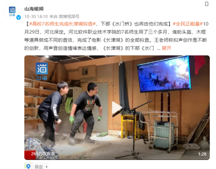 有媒体10月30日报道称,“10月29日,河北保定。河北软件职业技术学院的7名师生用了三个多月,借助头盔、木棍等道具做成不同的音效,完成了电影《长津湖》的全部拟音。王老师称拟声创作是不断的创新,用声音创造情绪表达情感,《长津湖》的下部《水门桥》的拟音也会由他们完成,目前正在筹备中。”该报道发布后,被广泛转载。