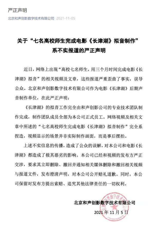 北京和声创影数字技术有限公司在其官方微信公众号平台发布的《关于“七名高校师生完成电影<长津湖>拟音制作系不实报道的严正声明”》中称,“近日,网络上出现“高校七名师生,用三个月时间完成电影《长津湖》拟音”的相关视频及文章,这些报道严重歪曲了事实,误导公中。”该公司声明称,“《长津湖》的拟音工作完全由和声创影公司的专业技术团队制作完成,制作团队成员全部为本公司正式员工。网络视频及相关文章中所述的‘七名高校师生完成电影《长津湖》拟音制作’完全系捏造,视频显示的场景并非实际制作画面,而是时候摆拍。”声明强调,“上述不实信息的传播,造成了公众的误解,对本公司和电影《长津湖》都造成了极其恶劣的影响。本公司已经和视频的发布方严正交涉,要求其立即删除、撤回并通知相关媒体删除和撤回相关视频与报道文件,发布澄清声明,对本公司公开赔礼道歉。同时,本公司保留对发布方提出索赔、追究其他法律责任的一切权利。”该公司网站介绍称,北京和声创影团队从2003开始,与国际顶尖的后期制作团队合作,业务内容涵盖音频、视频、特技制作,公司位于北京市经济技术开发区(亦庄)地盛西路1号。此前,9月30日,北京和声创影数字技术有限公司官方微信公众号曾发文称,电影《长津湖》“后期声音制作阶段,Soundfirm接下重任,无数版本更迭,180分钟的成片,三大导演电影声音的风格化塑造及全片平衡,二十多人组成的攻坚团队在两个月内完成一场炮火纷飞大规模战役的声音制作,Soundfirm堪称创造了电影声音后期制作的奇迹。”记者注意到,截至11月6日12时,上述公司声明中所提的“高校7名师生完成长津湖拟音”这一报道仍在多个网络平台搜索可见。