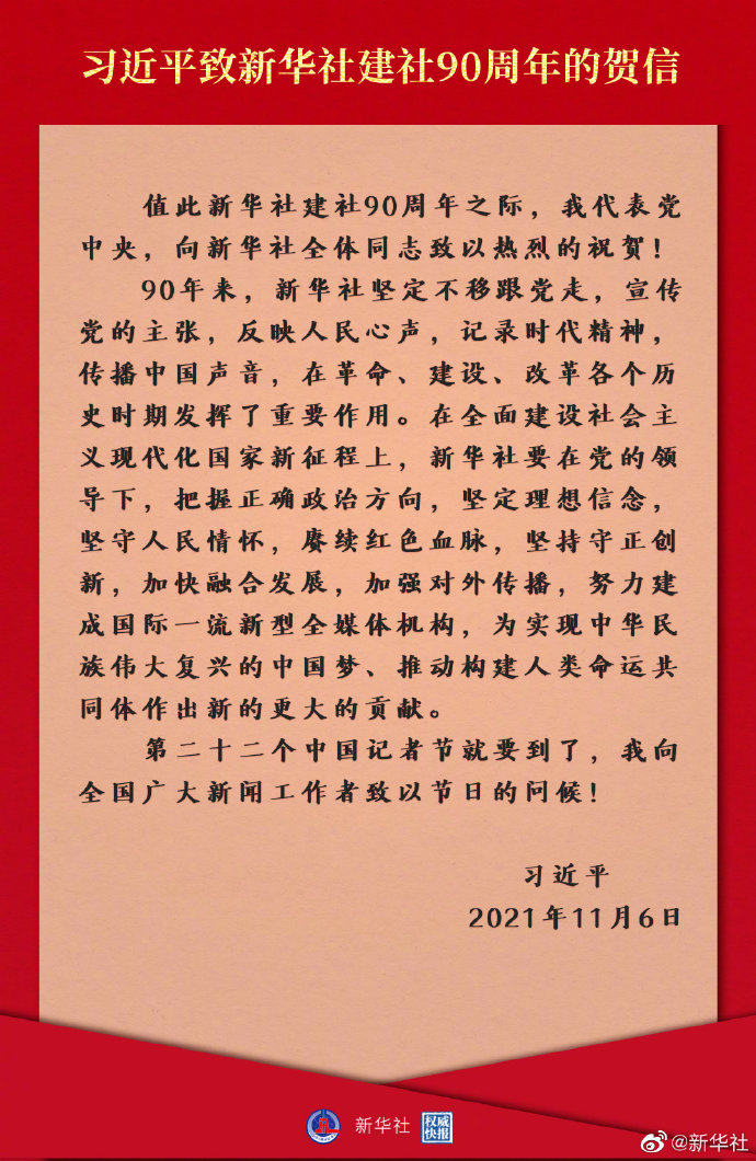 新华社北京11月6日电中共中央总书记、国家主席、中央军委主席习近平致信祝贺新华社建社90周年,代表党中央向新华社全体同志致以热烈的祝贺,并在第二十二个中国记者节到来之际,向全国广大新闻工作者致以节日的问候。