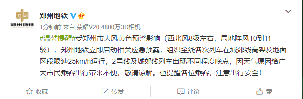 因大风预警,郑州地铁2号线、城郊线限速运营