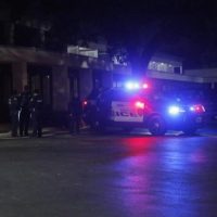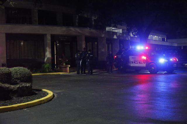 11月6日凌晨,警方人员聚集在美国休斯敦一家酒店门口。警方将这家酒店设为亲属查询失联现场观众联络点。(新华社发,劳承跃摄)