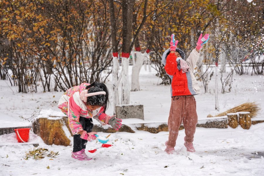 2021年11月6日,内蒙古呼和浩特,立冬前夕,今年第一场雪如约而至。人们走出家门赏这久违的雪天,雪地上嬉戏的孩子们留下欢歌笑语。