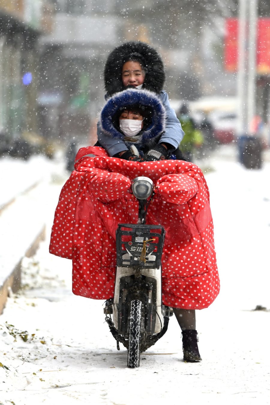 2021年11月6日,内蒙古呼和浩特,市民雪中出行。